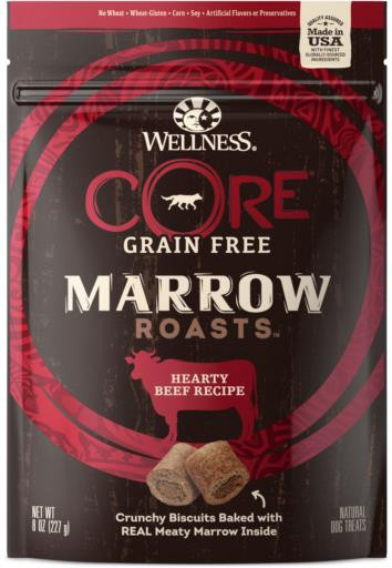 Wellness Core Grain Free Hearty Beef Marrow Roasts Dog Treats, 8 Oz. are wholesome, all natural, wheat free, grain free, tender soft dog treats made in USA only. These tasty and tantalizing treats have a delicious center that’s packed with vitamins and minerals. Pups can’t keep their paws off of them!